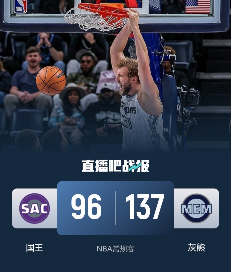 灰熊(5-11):阿尔达马29分5板3助2帽、兰代尔21分6板、科沃德19分4板4助、埃迪16分4板2断、韦尔斯13分1板2助、普罗斯珀11分1板1助、斯潘塞7分2板6助、GG·杰克逊6分9板1助、马沙克6分2板、威廉姆斯4分5板15助2断、康查尔3分7板3助2断、波普2分3板7助